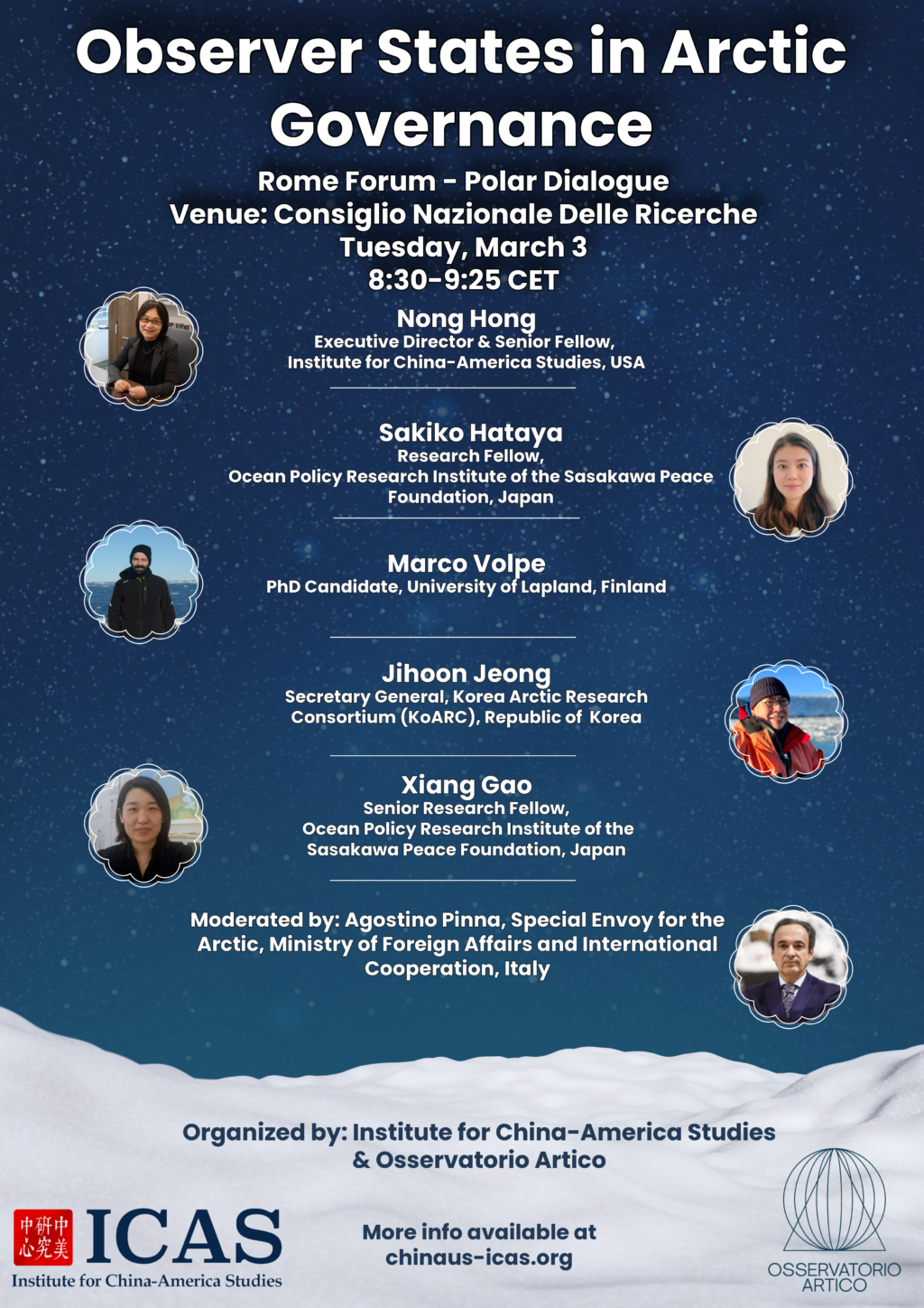 The panel will feature ICAS’ Executive Director, Dr. Nong Hong, as well as Sakiko Hataya and Dr. Xiang Gao from the Ocean Policy Research Institute of the Sasakawa Peace Foundation, Marco Volpe from the University of Lapland, and Jihoon Jeong of the Korea Arctic Research Consortium. The panel will be moderated by Agostino Pinna, Special Envoy for the Arctic in the Ministry of Foreign Affairs and International Cooperation. Full bios for all participants can be found below.