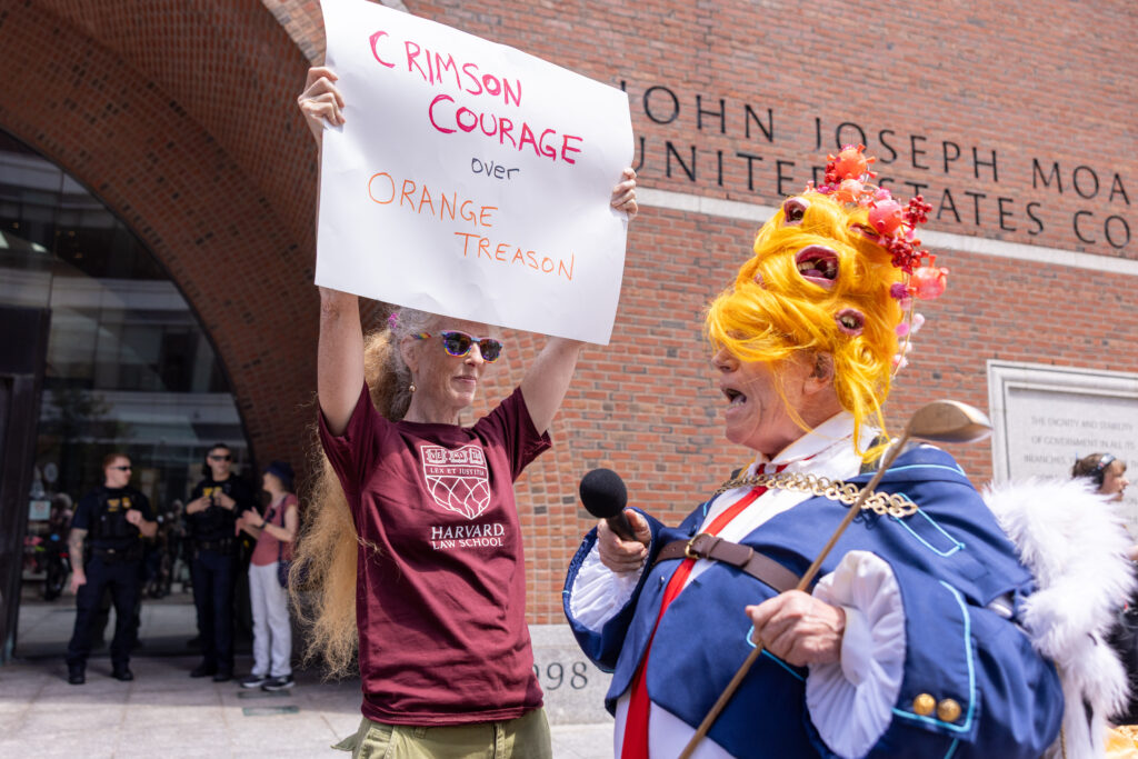 A person dressed as Donald Trump interacts with a group of protestors outside of the John Joseph Moakley United States Courthouse on July 21, 2025 in Boston, Massachusetts. Lawyers for Harvard University argued in federal court on Monday that the federal government's freeze of more than $2 billion in grants and contracts is illegal and should be reversed. (Photo by Scott Eisen/Getty Images)