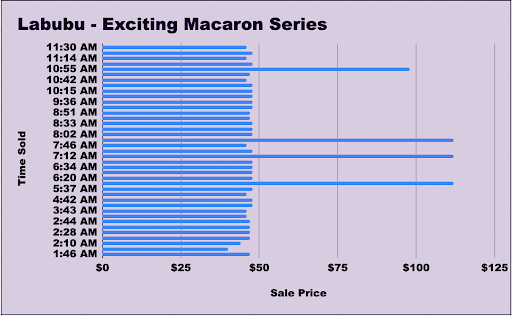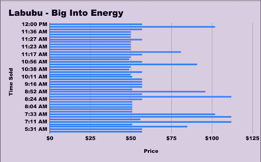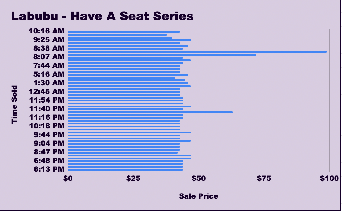 Although each line has spikes in price and tops out at $112, the majority of resold Labubus are sold for between $43-$57. When on the hunt for Labubus at in person merchants, this appears to be around the norm; at 4 non Pop Mart verified resellers, the average was $60, bringing the average price of a Labubu on the reseller market to $52. A Labubu right from the source is $27.99. The reseller market is therefore typically about double the price for a blind box.