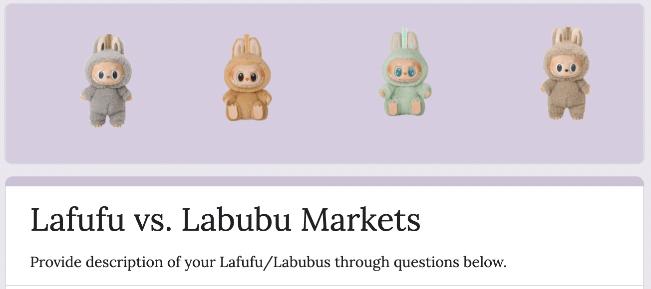Every seller openly admitted they were counterfeits, sometimes unprompted, in Washington D.C., Pennsylvania, New York, and New Jersey. All Lafufus also had a ‘Made in China’ export tag. Labubus are generally more popular on the West Coast than the East, which may account for some regional difference in price. One Lafufu was bought already unboxed and purchased due to being a desirable color (Sesame), all others were bought blind. My total cost of participation for the experiment was $118, which could have gotten me approximately 4 real Labubus, or two on the reseller market. To better capture the market, I’ve created this questionairre for those who have Labubus and Lafufus to provide information, share with your most obsessed friends. The Lafufu market is vast and expanding and it’s of utmost importance to capture the counterfeit market in real time.