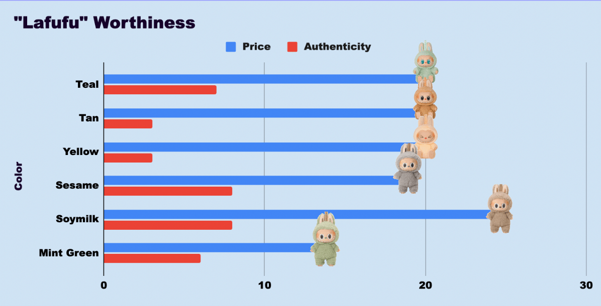 Although my personal collection is small, I rated the counterfeits on authenticity and price. No Lafufu cost more than a Labubu but none were a wholly convincing Labubu. Most Lafufus are circa $20. Points for authenticity, on a 0-10, scale were deducted if a Lafufu: